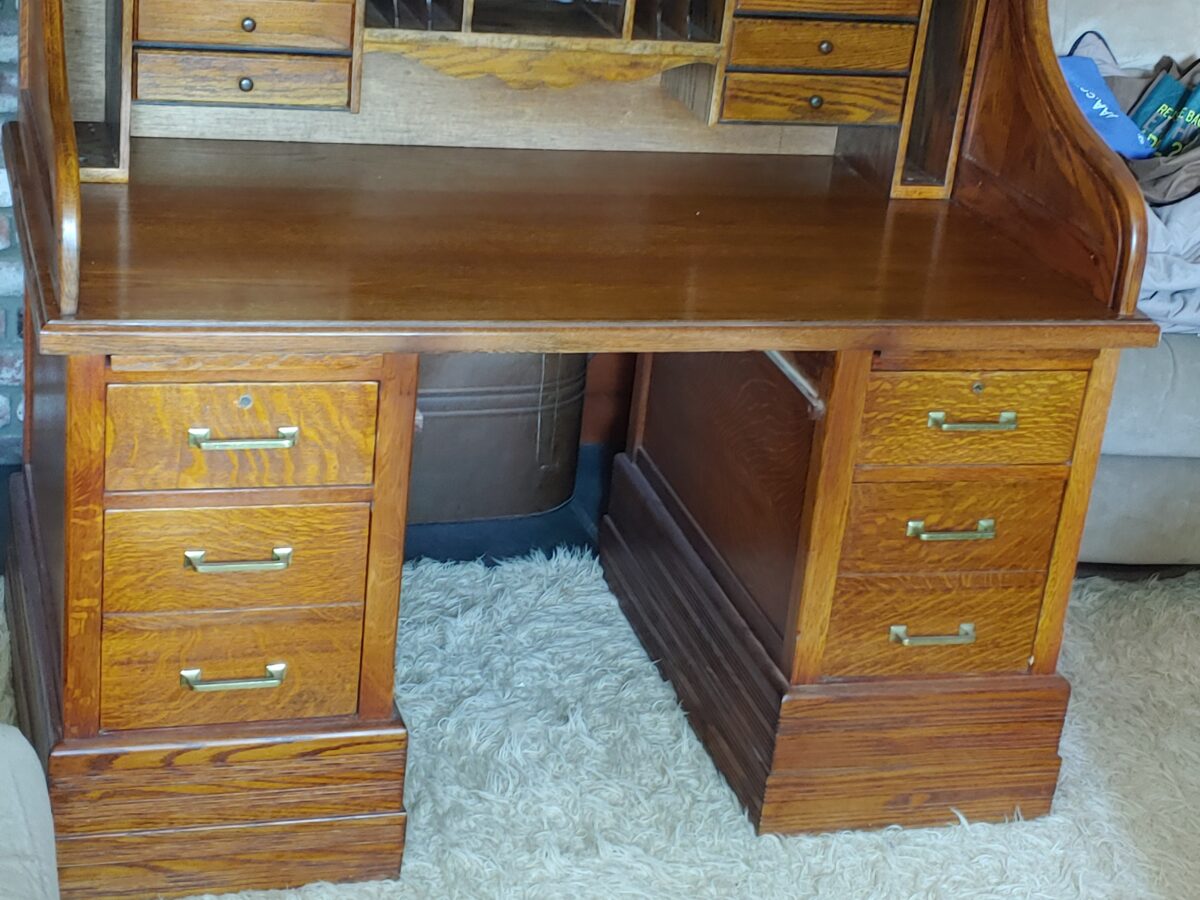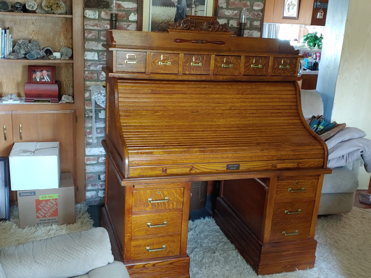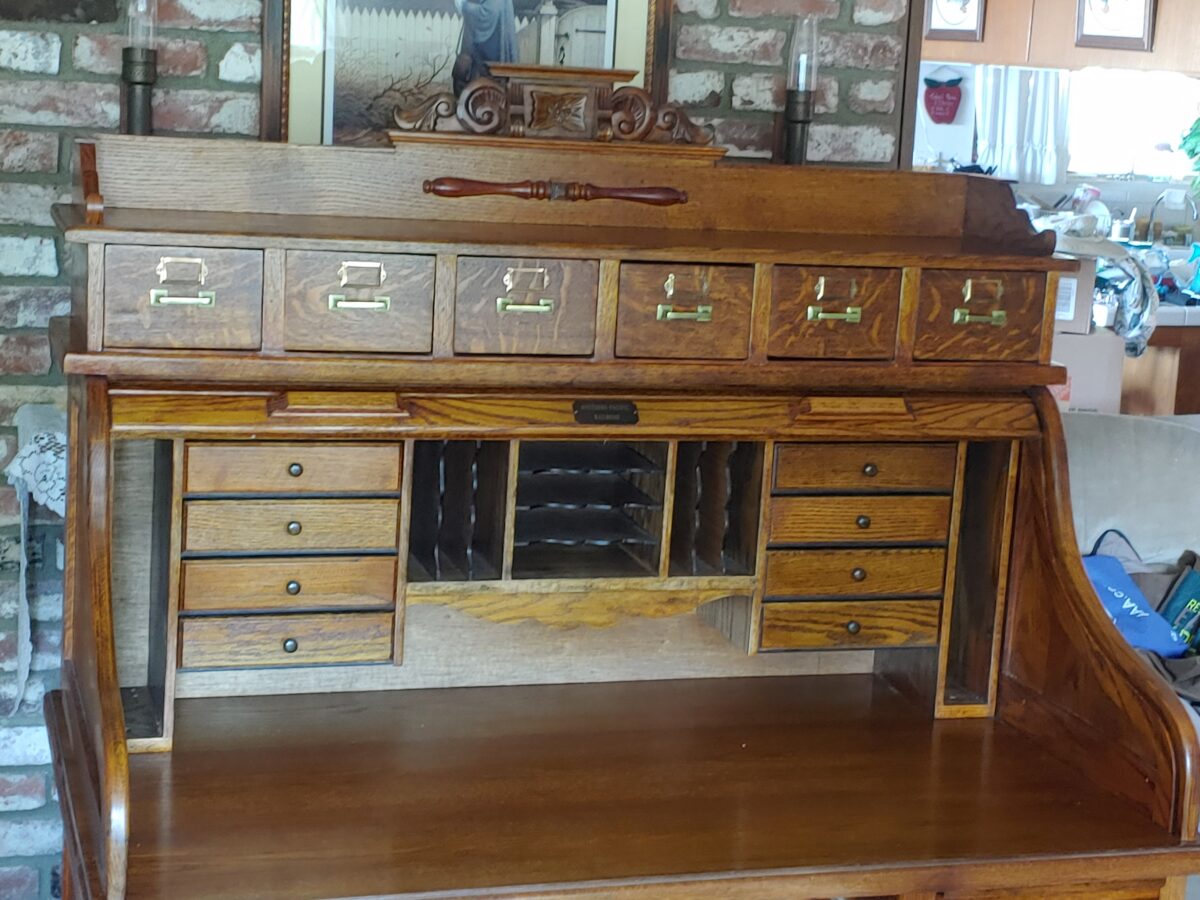 Our father was an avid train fan. He grew up in Indiana and had trains around him all the time. Over 20 years ago he saw this desk and fell in love with it and purchased it. He rented a trailer and hauled it back here from the Midwest. It is a true antique.